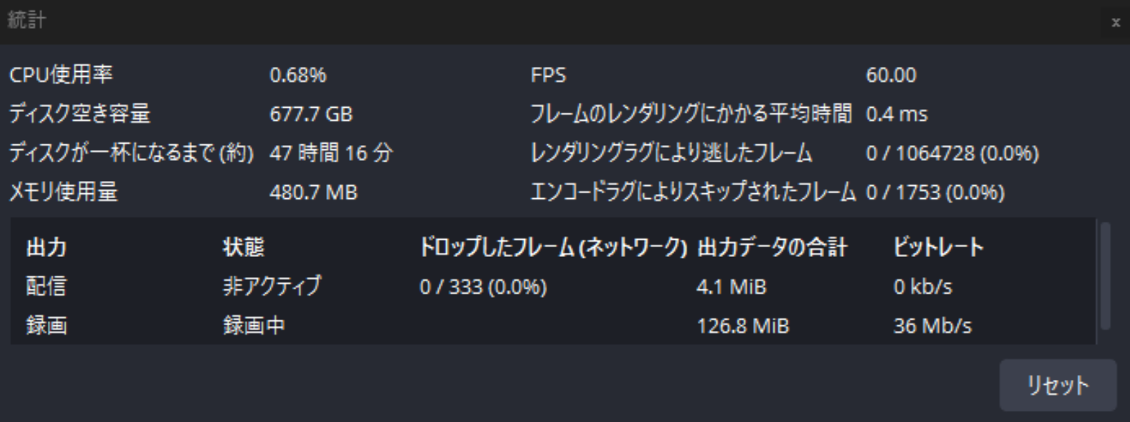 OBS統計ウィンドウ(ドック → 統計)で録画中のパフォーマンスを確認できる。