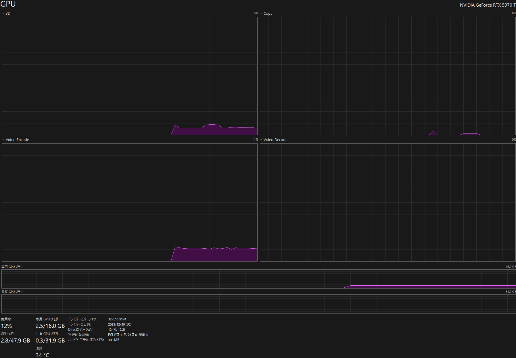 Windowsタスクマネージャーのパフォーマンスタブでの実測値(Core i9-14900K + RTX 5070 Ti・NVENC録画中):