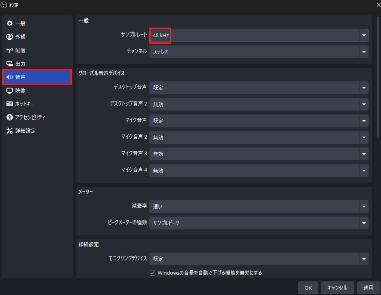 サンプルレートは必ず48 kHzに設定する。PCの音声設定(Windowsのサウンド設定)も48kHzに揃えると音ズレが防げる。