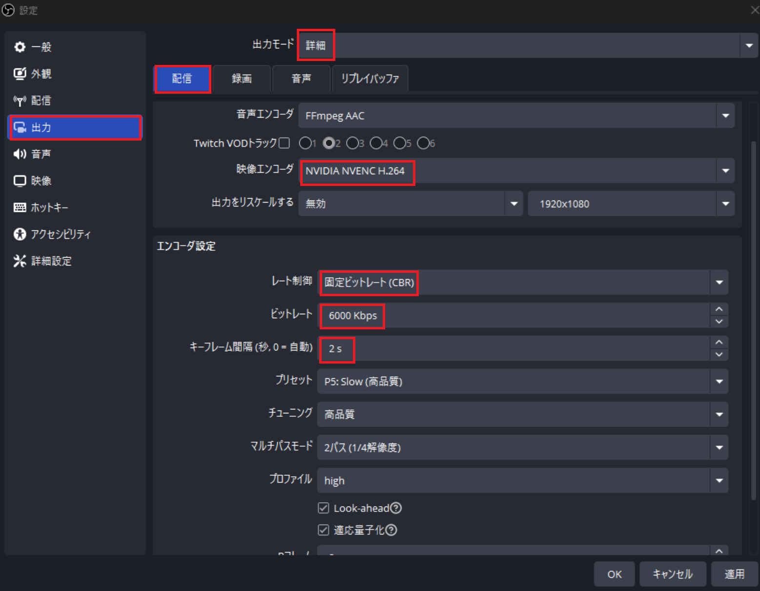 | キーフレーム間隔 | 2s(Twitchの要件) |