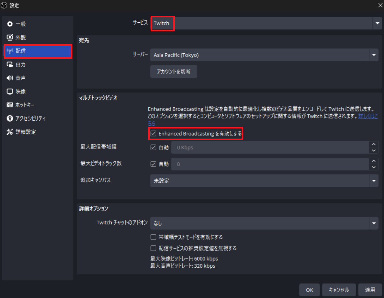 有効にするとOBSが複数品質の映像を同時にエンコードしてTwitchに送り、Twitchが視聴者の回線速度に合わせて最適な品質を配信する。最大配信帯域幅・最大ビデオトラック数は0(自動)のままでよい。