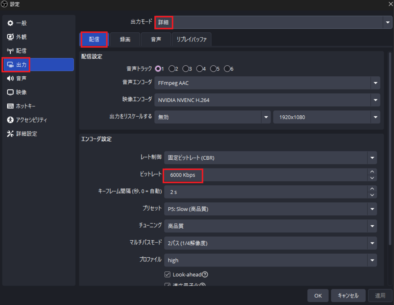 「設定」→「出力」→ 出力モードを「詳細」にして配信タブを設定する。