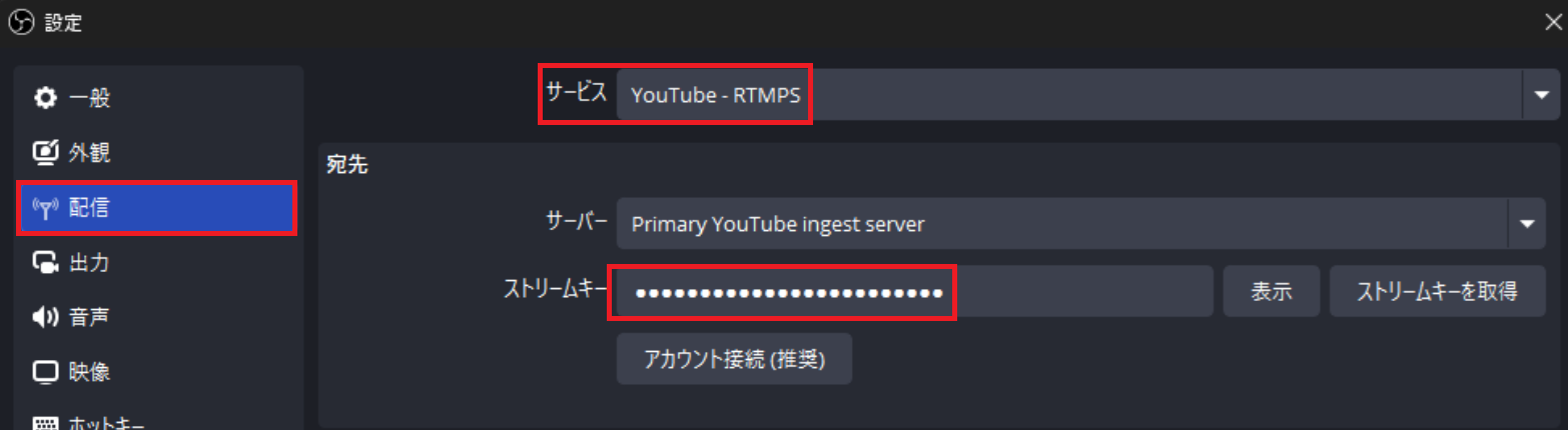 - OBSの配信設定でサービスを「YouTube - RTMPS」にしてキーを貼り付ける