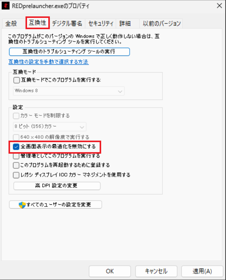 - 「フルスクリーン最適化を無効にする」にチェック