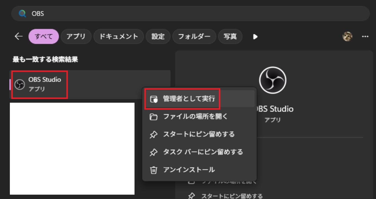 - スタートメニューでOBSを検索してアイコンを右クリック