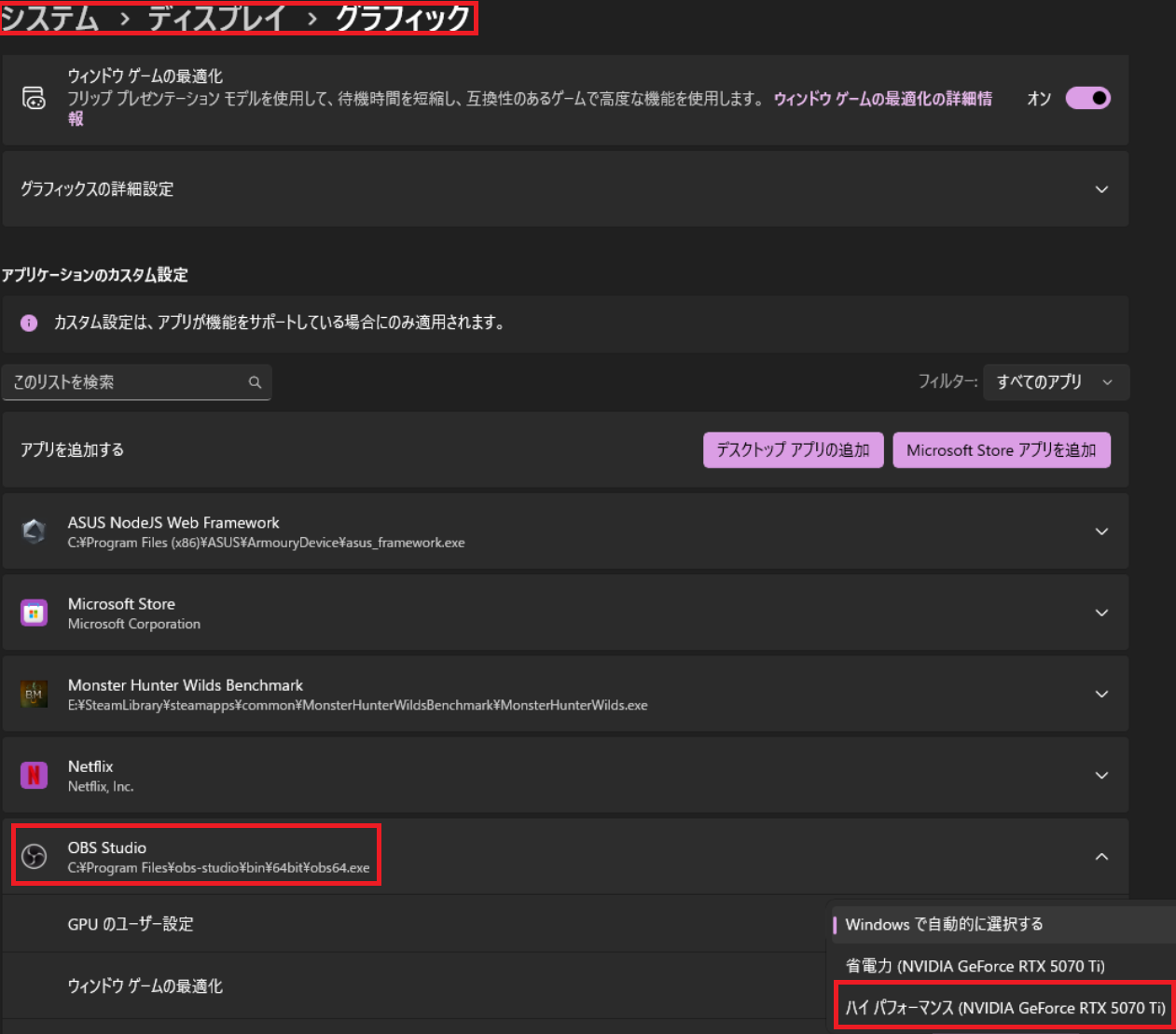 手順3 OBSのGPUをハイパフォーマンスに設定する