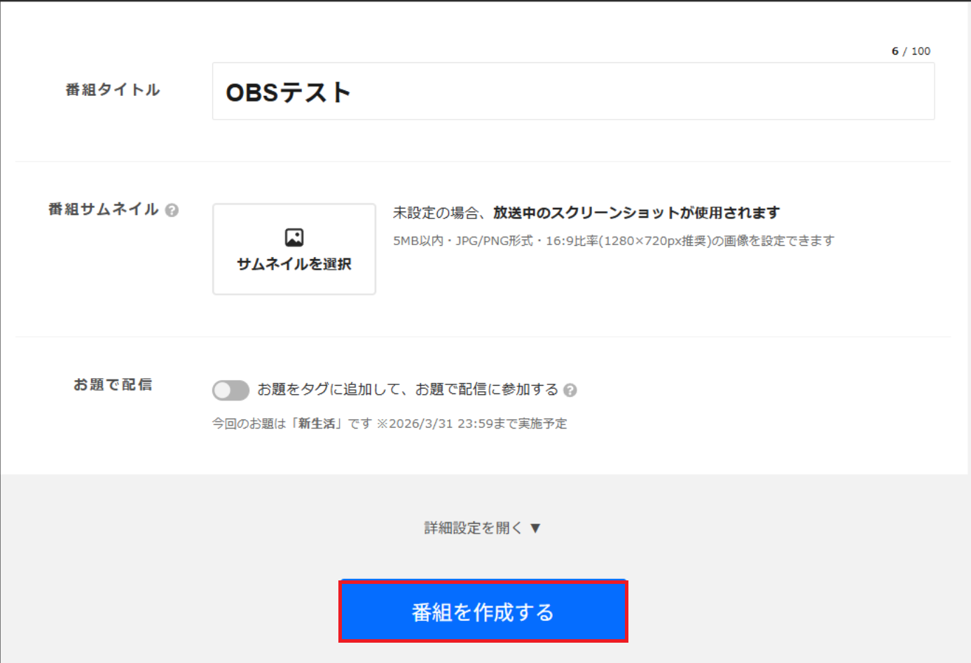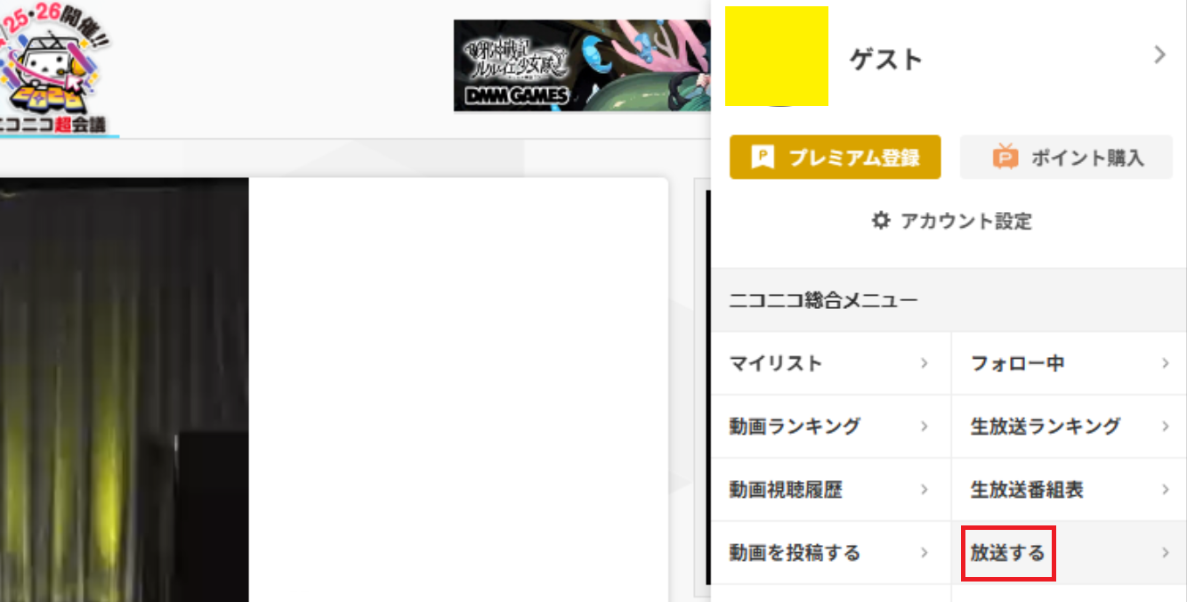 nicovideo.jp にログインして「生放送」→「放送する」を開く。