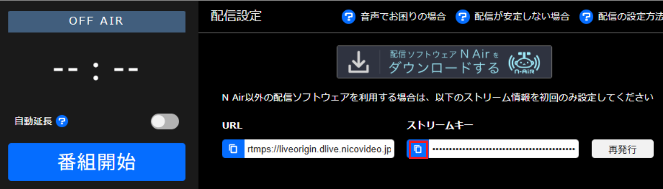 ニコニコ生放送のストリームキーは放送ごとに変わるため、放送開始直前に再取得することを推奨する。