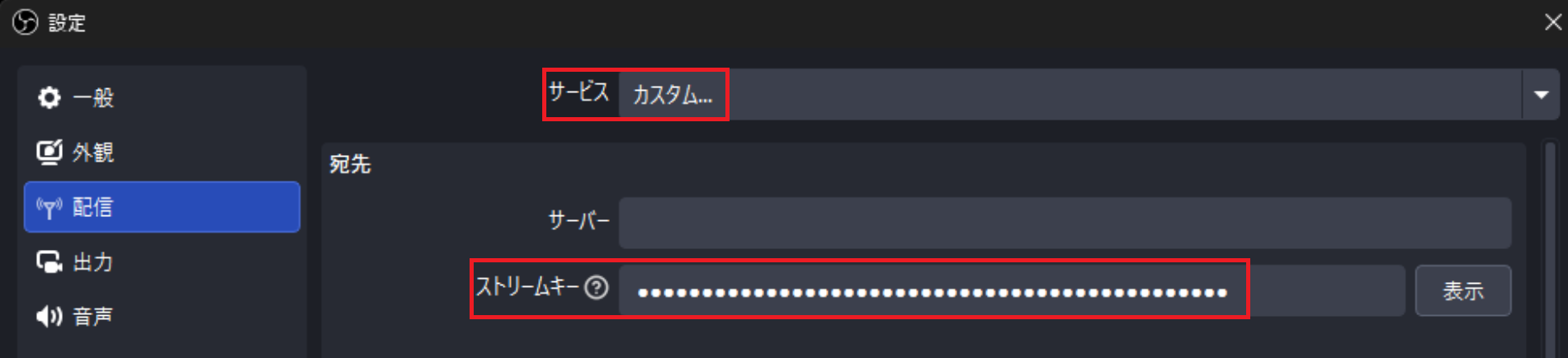 OBSの「設定 → 配信」でサービスを「カスタム」に選択し、ニコニコ側で取得したサーバーURLとストリームキーを入力する。