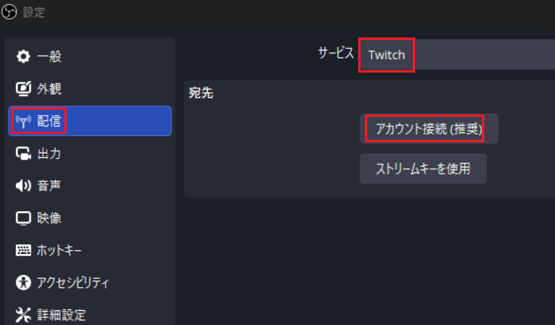 「設定 → 配信」でサービスを「Twitch」に選択し「アカウントに接続」をクリックする。Twitchアカウントで認証するとストリームキーが自動設定される。