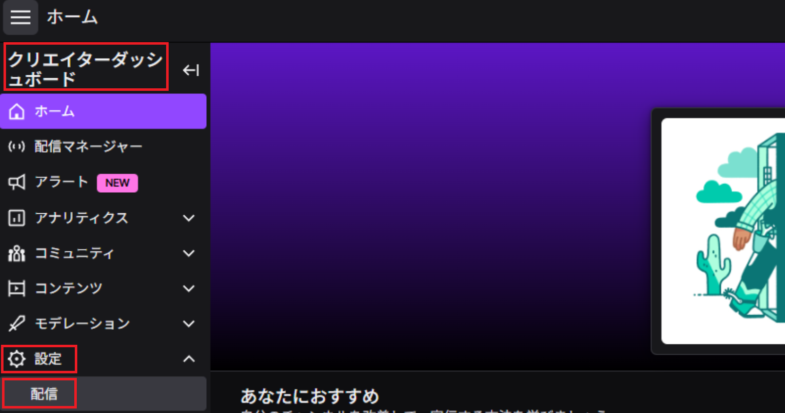 Twitchダッシュボード(creator.twitch.tv)→「設定」→「配信」を開く。
