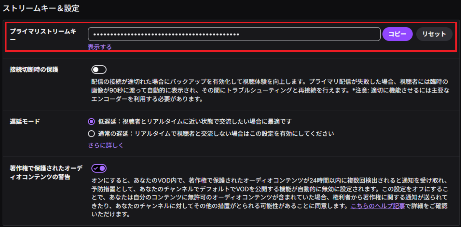 「プライマリストリームキー」横の「コピー」をクリックしてキーを取得する。