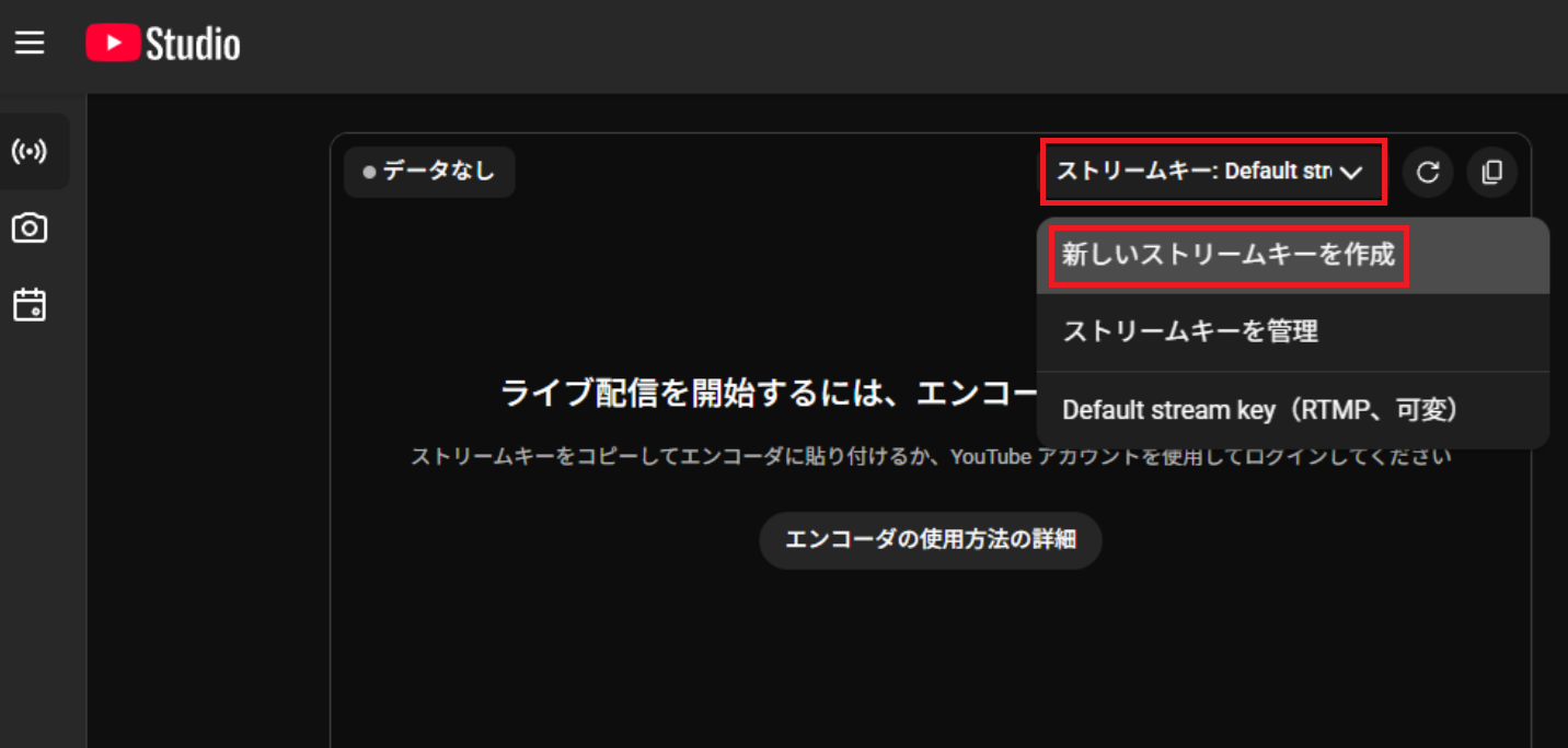 YouTube Studioの左メニュー「ライブ配信」→「エンコーダ配信」を開く。