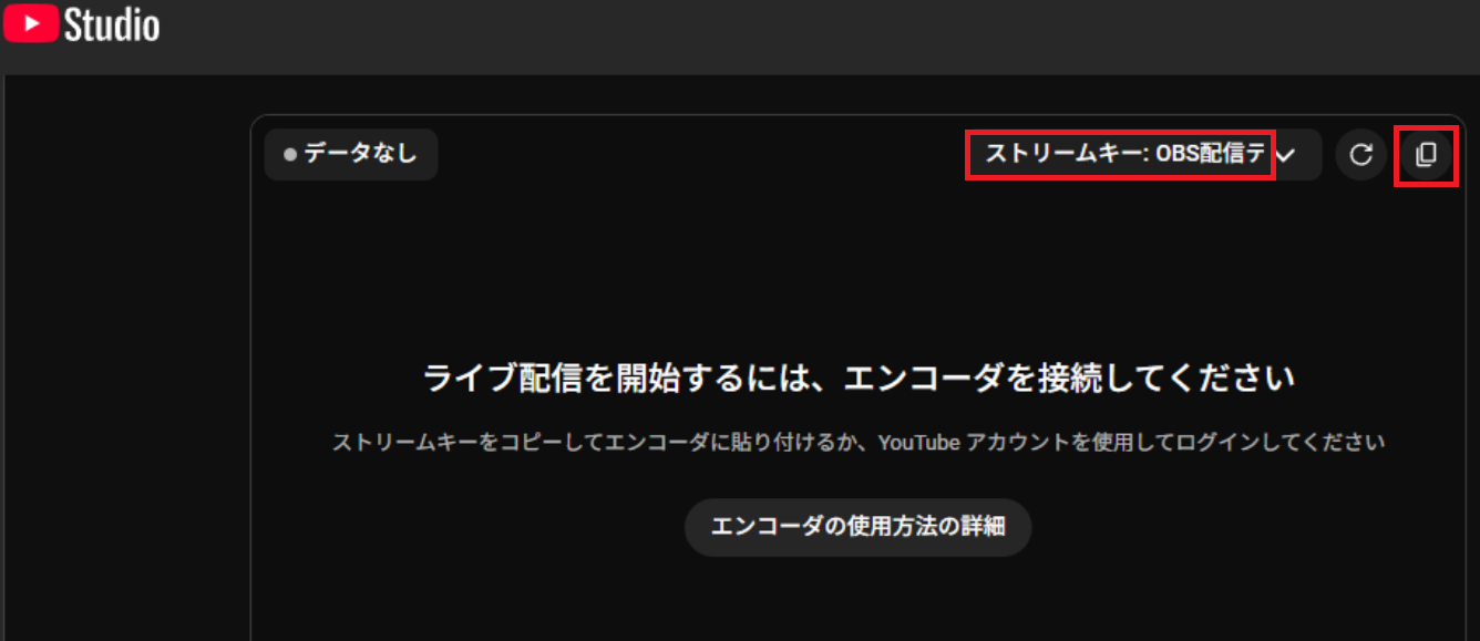 ストリームキーのコピーボタンをクリックしてキーを取得する。